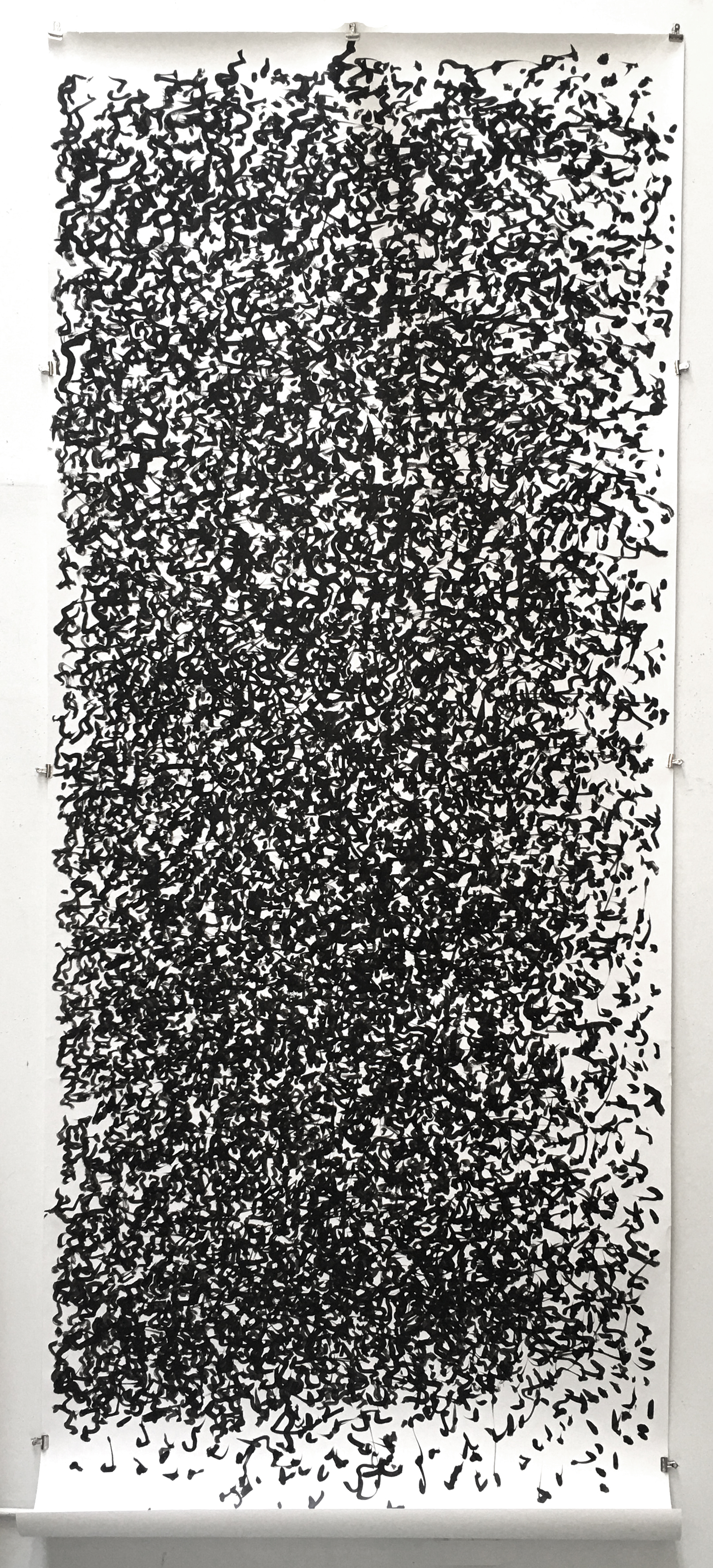 This is an 11 ft study in the Proximity Scroll series (rolling the paper for each section) for an eventual 30ft x 9ft drawing where there is only direct ecstatic drawing application
